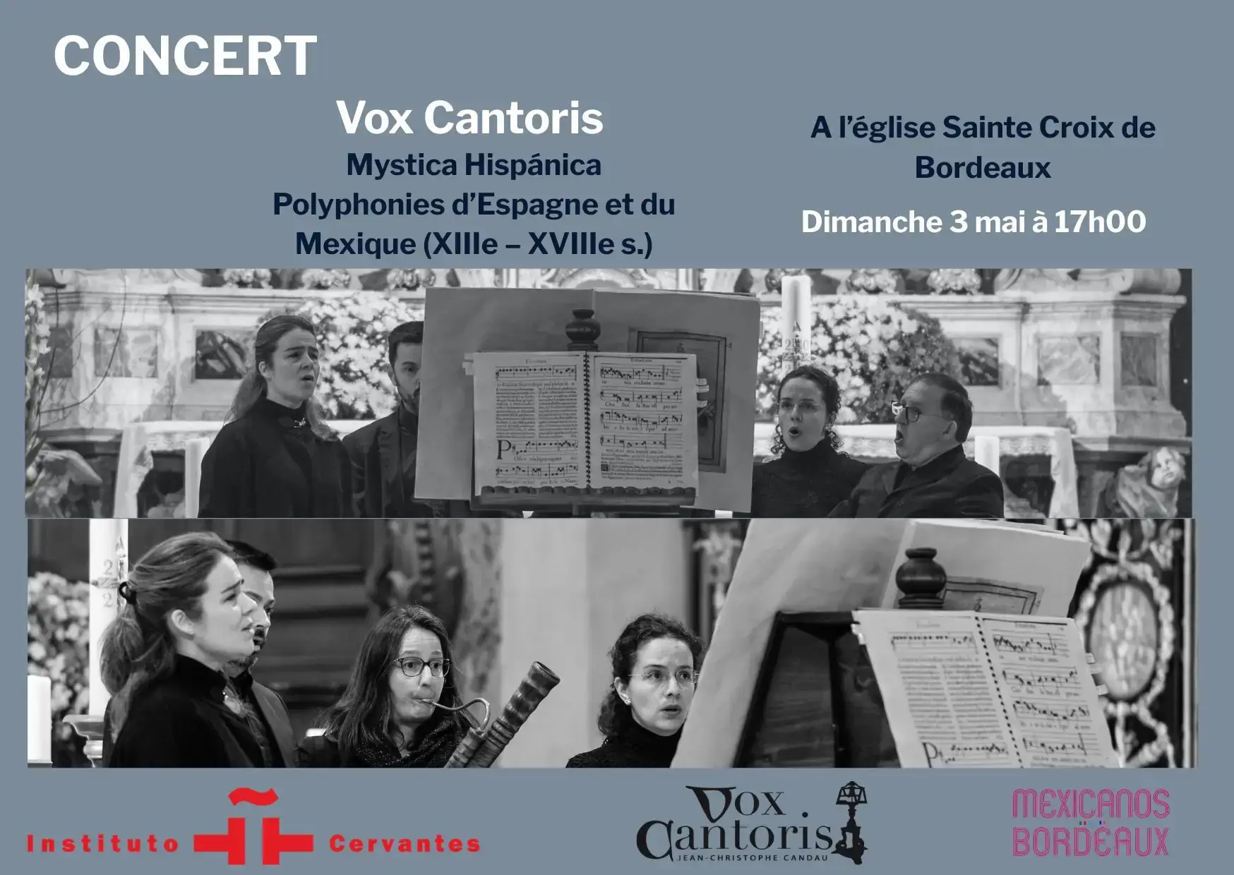 ENSEMBLE VOX CANTORIS À la recherche des musiques oubliées. En Europe et en Amérique latine Recherche Fonds des cathédrales et des couvents Polyphonie (XVIe - XVIIIe siècle) Le plain-chant Lecture directe sur fac-similé Chant au lutrin La transmission ENSEMBLE VOX CANTORIS Réservez vos places ! Notre dernière création sonore est disponible ! LA PRESSE EN PARLE ! » Un auditeur de notre temps va recevoir cette musique comme une bénédiction ! « Frédéric Muñoz, Resmusica, Janvier 2026. LES DERNIERS PROGRAMMES AU DERNIER SOUFFLE MYSTERIUM SOLIS TRÉSORS DE LA CATHÉDRALE DE GUADALAJARA (XVIIe-XVIIIe s.) ECCE PANIS ANGELORUM C’EST L’EXCELLENT CLAUDIN ! SPLENDEURS POLYPHONIQUES DU MEXIQUE SEMAINE SAINTE EN NOUVELLE-ESPAGNE REQUIEM PEDRO HEREDIA ABONNEZ-VOUS A LA NEWSLETTER Nom Adresse e-mail Envoi SUIVEZ-NOUS SUR FACEBOOK Suivre DEVENEZ MÉCÈNE ! INFORMATIONS